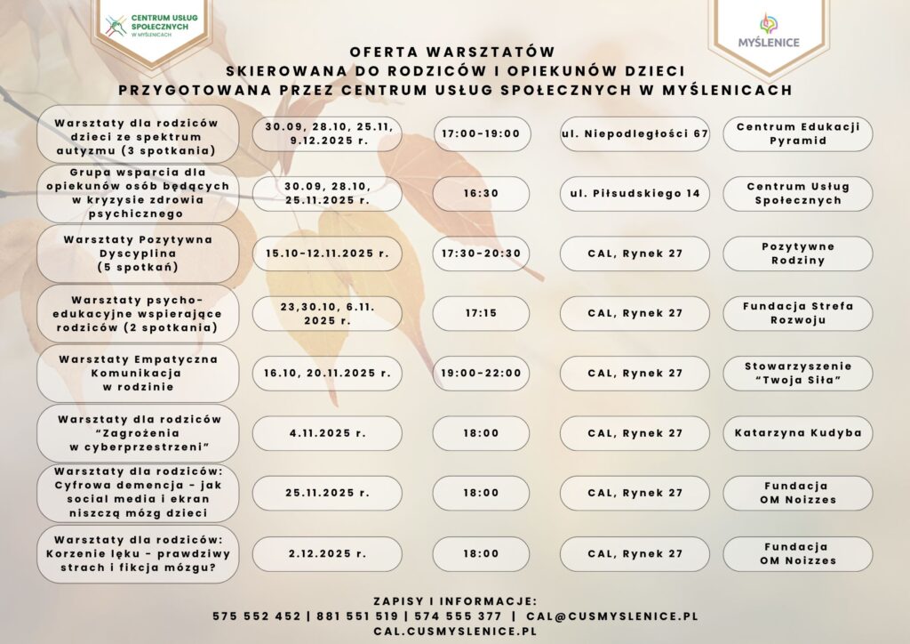 Przedstawiamy ofertę warsztatów skierowanych do rodziców i opiekunów dzieci przygotowaną przez Centrum Usług Społecznych w Myślenicach.